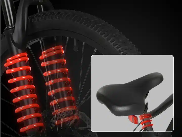 The combination of adjustable front suspension, hydraulic rear shocks, and wide tires effectively reduces bumps and vibrations across uneven surfaces, maintaining comfort and control even on demanding trails.